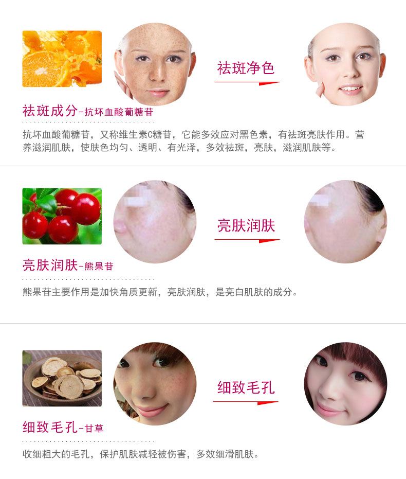 產(chǎn)品作用:七到十天凈色淡斑、亮膚潤(rùn)膚、補(bǔ)水保濕、細(xì)致毛孔,不紅腫不脫皮。